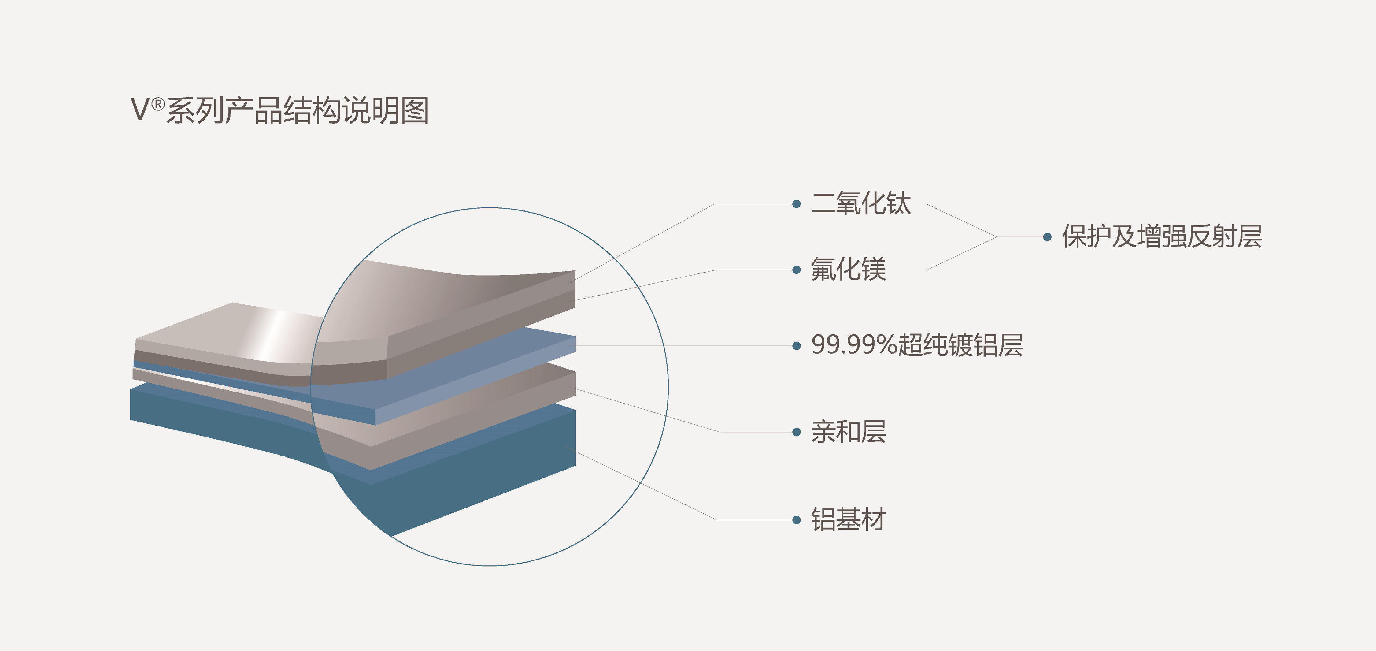 V系列采用金屬表面真空鍍膜技術(shù)。材料由鋁基層、親和層、99.99%超純鍍鋁層、保護(hù)及増強(qiáng)反射層(TiO2+MgF2*)構(gòu)成。不同于常見的SiO2組合保護(hù)及增強(qiáng)反射層,V系列采用了TiO2+MgF2組合,這種新組合通過測試,結(jié)果顯示比SiO2+TiO2組合的材料提高了1.5%的總反射率,最高甚至可達(dá)到鍍99.99%的超純銀才可達(dá)到的98%的反射率。該產(chǎn)品將在大幅度提高反射性能的同時降低客戶的用料成本。